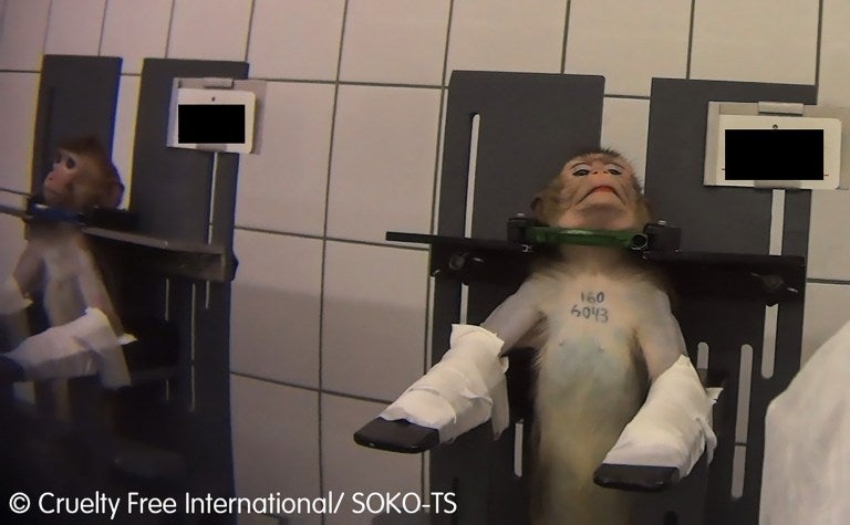 Most of the footage focuses on the monkeys. In the video, their necks are restrained with large metal bars while they await their horrific fate.