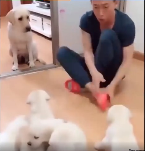 Looking at the puppies are being punishment, the mother dog does not know how to advocate them. When she see that the owner is about to beat her children by his shoes, she rushes into him and try to catch the shoes in order to save her child from being beaten..